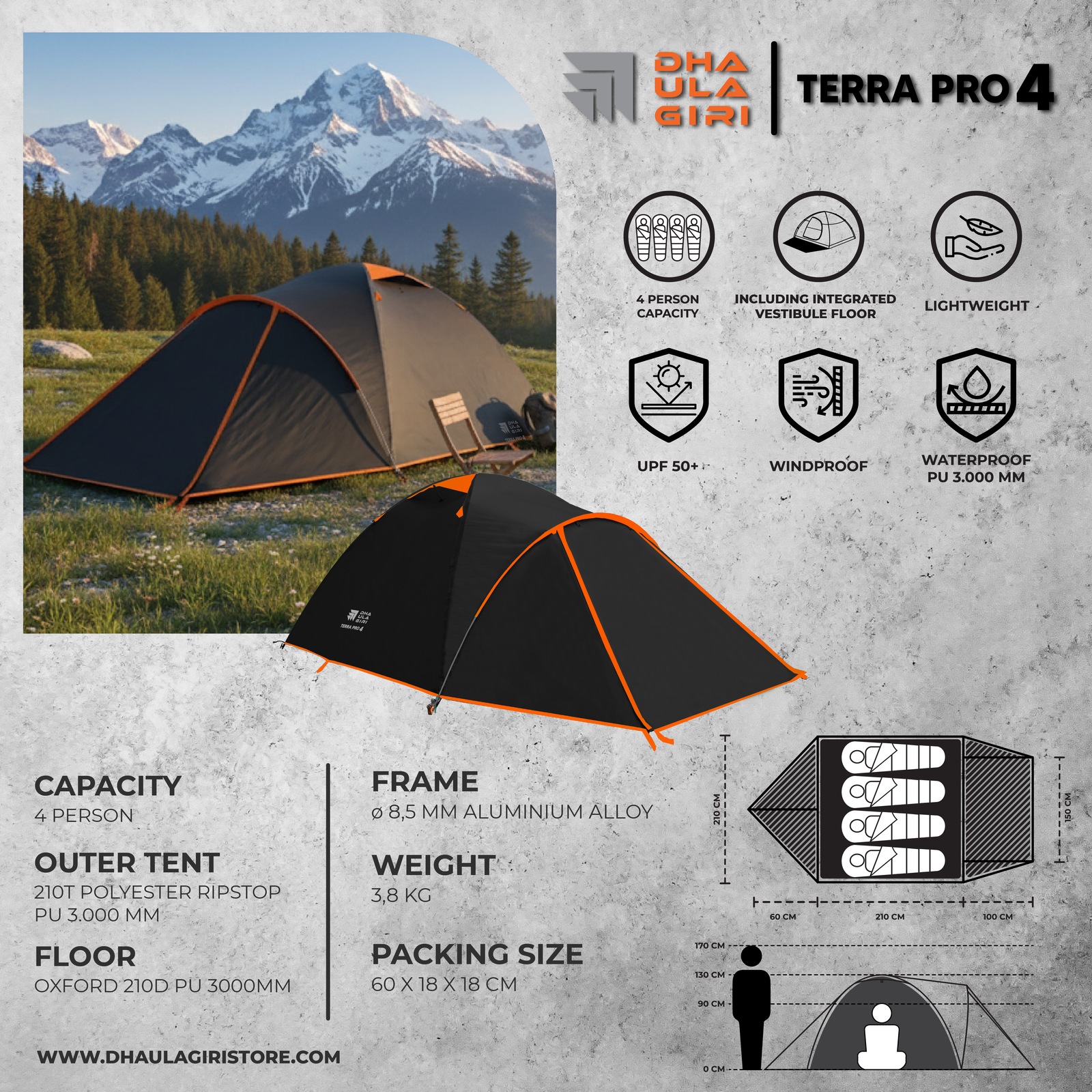 KIni hadir varian warna terbaru dari Terra pro 4 yaitu berwarna hijau. Tidak hanya warnanya saja yang update sob juga footprint sudah berpattern sehingga tenda lebih cantik dan sangat akan detail. Penggunaan warna hijau terang ini sangat menarik perhatian ketika digunakan di campground sob tidak hanya bisa untuk lebih menyatu dengan alam. Untuk spesifikasinya sama seperti seperti Terra pro 4 terdahulu yaitu untuk outer menggunakan 210 T Polyester PU 3.000mm dan sudah UPF 50+. Untuk frame sudah menggunakan alumunium alloy 7001 untuk semua frame menjadikan tenda ini ringan untuk di golongan kapasitas tenda. Sempurna untuk keluarga atau teman-teman, tenda ini memberikan ruang yang luas dan stabilitas luar biasa, siap untuk menemani petualangan Anda di alam terbuka. Siap berkemah dengan gaya?