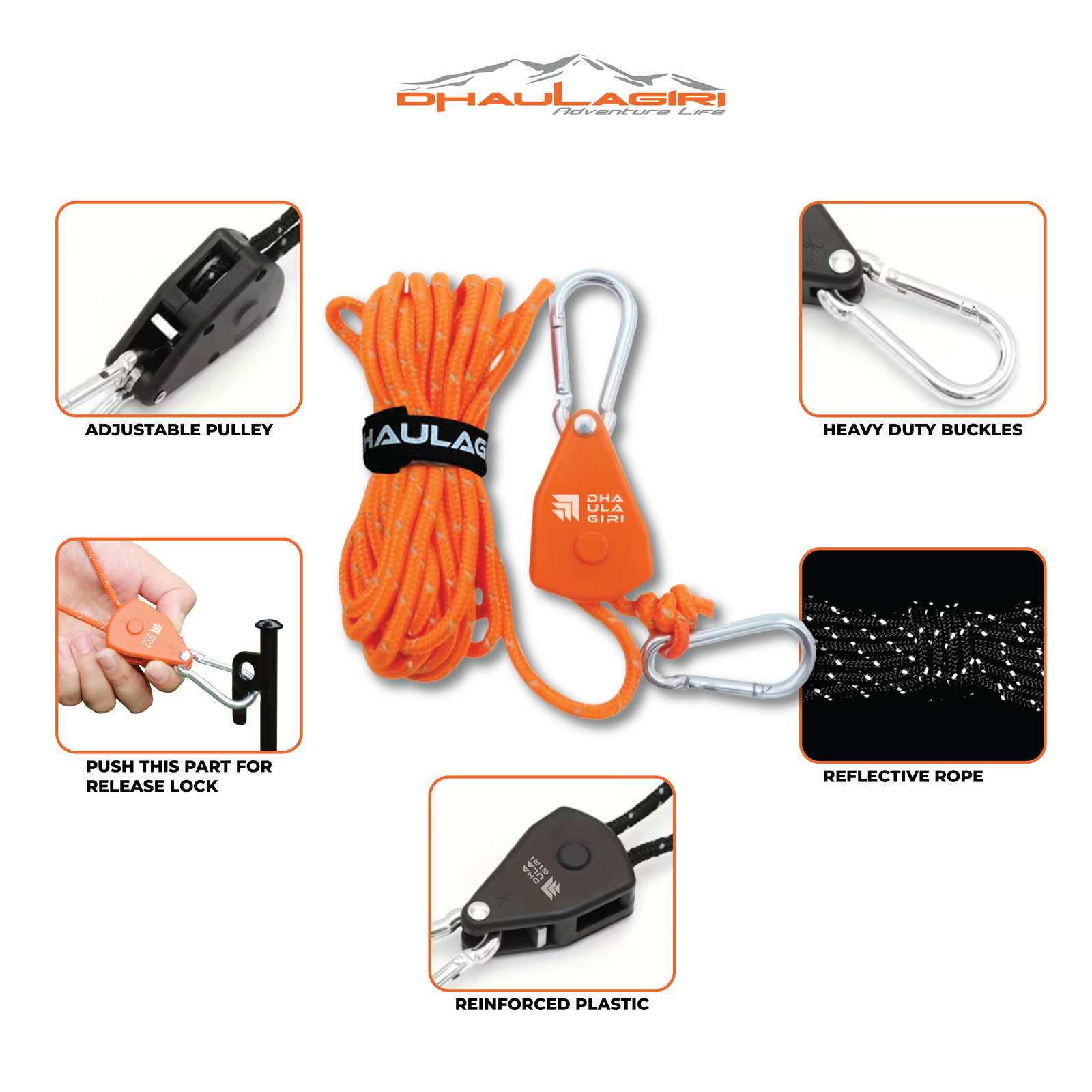 Mendirikan tenda besar atau shelter sekarang jauh lebih sat-set dengan Pulley Adjustable Rope. Lupakan drama tali kendur atau ribet ikat simpul mati yang susah dilepas.