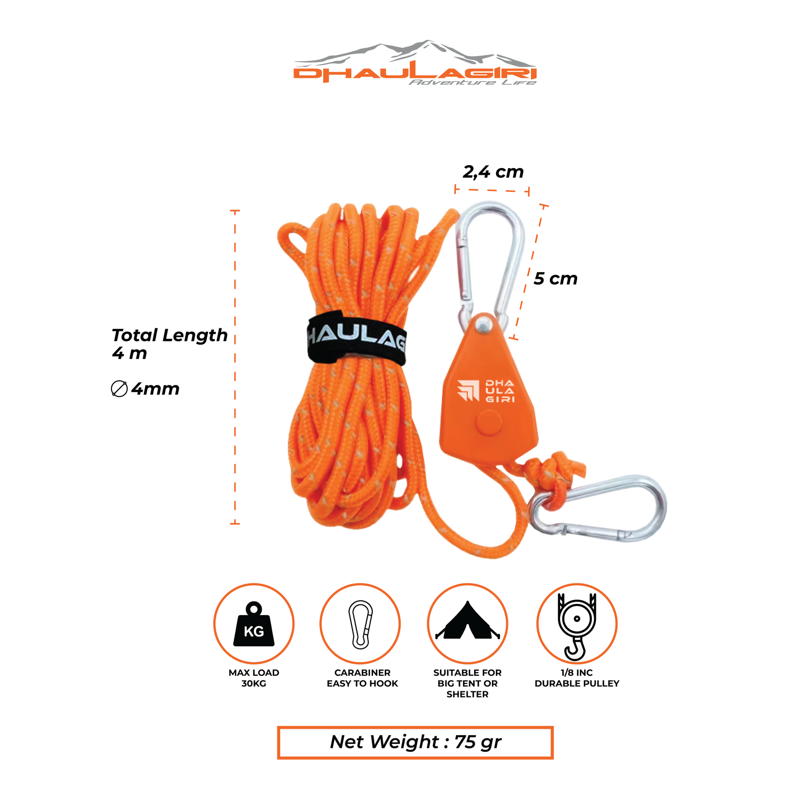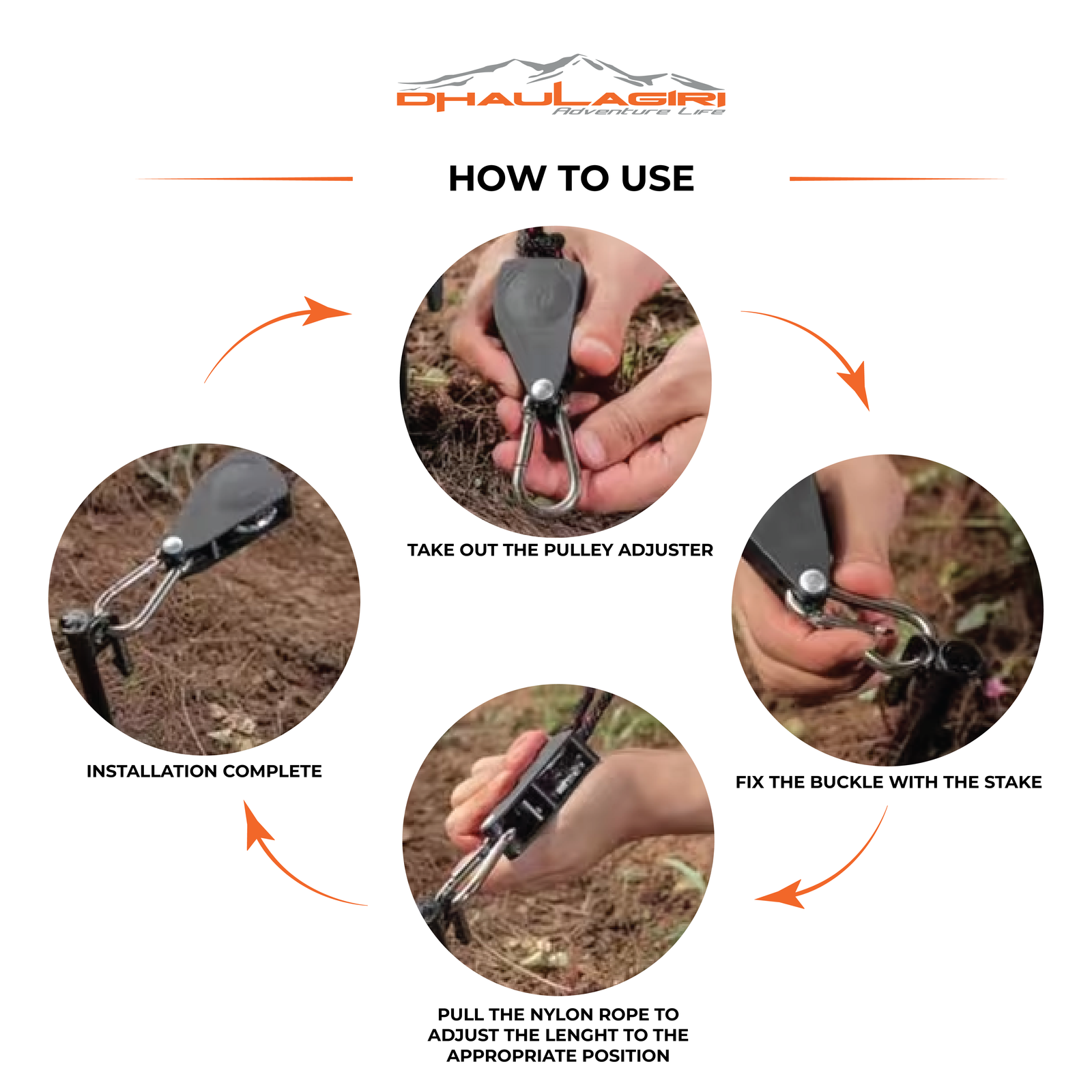 Kenapa harus pakai Pulley ini? ✅ Sistem Penguncian Otomatis: Tinggal tarik, tali langsung terkunci rapat. Gak bakal melorot! ✅ Double Carabiner: Sudah dilengkapi 2 carabiner di ujung-ujungnya. Tinggal klik ke pasak dan tenda. ✅ Adjustable: Atur kekencangan tenda sepresisi mungkin hanya dengan satu tangan.