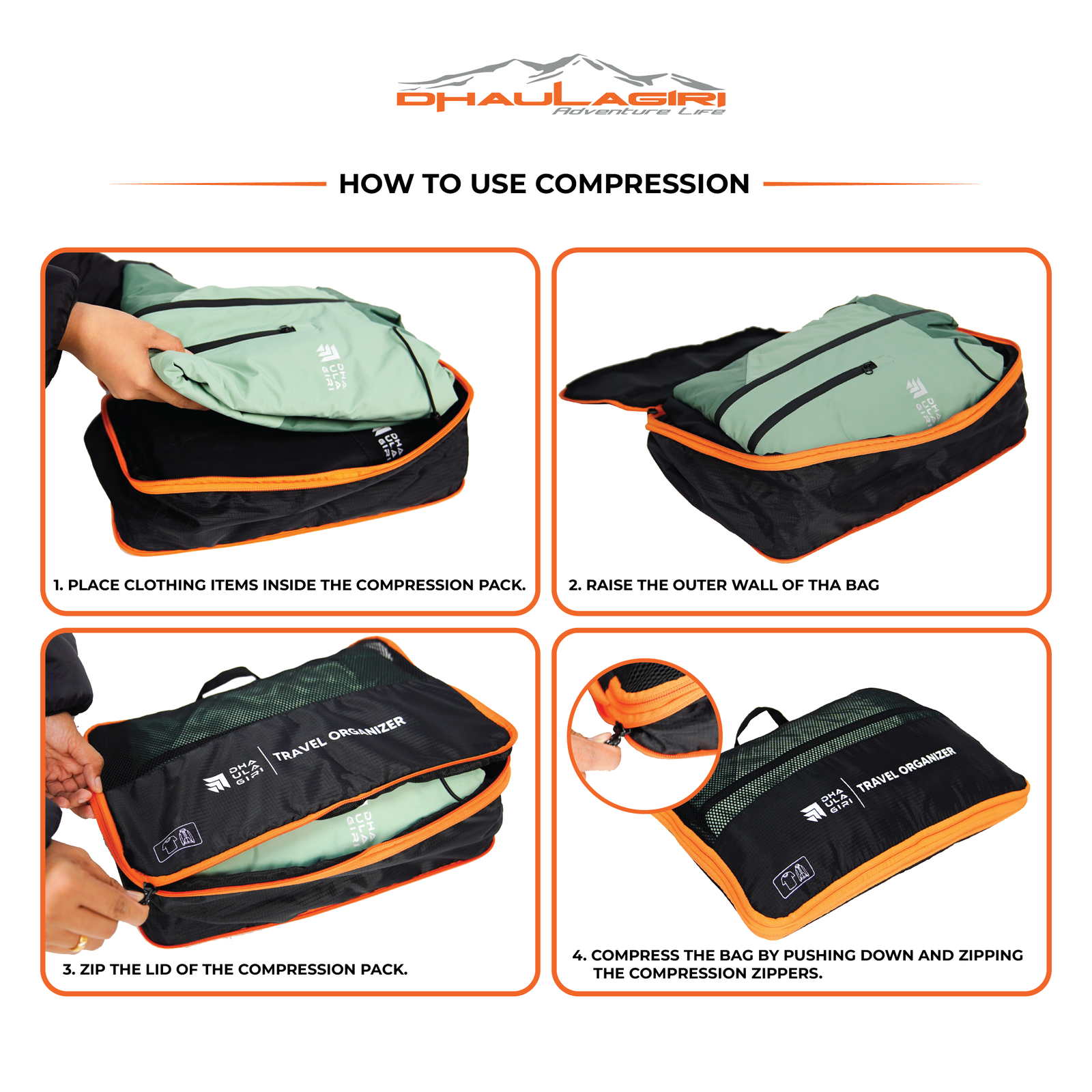 Tinggal atur, tutup, dan compress—langsung hemat space seketika. Plus bahan water repellent memastikan isi tetap bersih dan terlindungi.